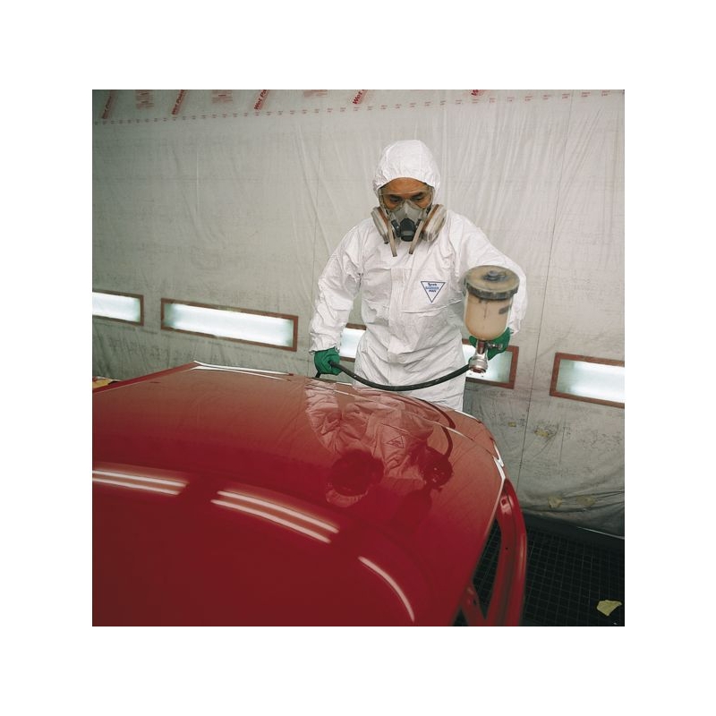 Non tissé Tyvek® de Dupont. Capuche en 3 parties pour un ajustement optimal (particulièrement adaptée au port du masque). Fermeture éclair avec blocage automatique et rabat en Tyvek®. Taille élastique collée, élastique aux poignets, à la capuche et aux chevilles. Utilisation : barrière contre les particules > 1µ, contre les liquides chimiques, résistance à la pression liquide 120 cm. Coloris : blanc Taille : 2 à 6 Norme : CE - Cat III - types 5B 6B - EN 1149-5 - EN 1073-2 - EN 14126