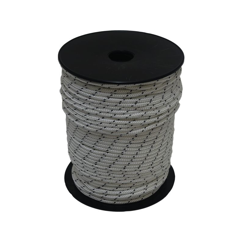 Tresse en polyamide spécialement fabriquée pour les lanceurs de moteur thermique. Haute résistance à la rupture et absorption des chocs au lancement du moteur. Carotte de 5 m ou bobine de 100 m.