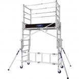 Utilisation sur sol plat. Usage intensif. Télescopique. En aluminium. Base pliante. Montage et démontage en sécurité, sans vis ni outils par 1 seule personne. 4 stabilisateurs rétractables. 4 roues Ø 125 mm orientable à 360 °. 7 hauteur de plancher réglable de 25 cm à 1,80 m. Hauteur de travail maxi. : 3,80 m Dimensions plancher : 1,30 x 0,60 m Charge maxi. : 200 kg/m² Poids : 56 kg Norme : EN 1004-1 - décret 2004 924