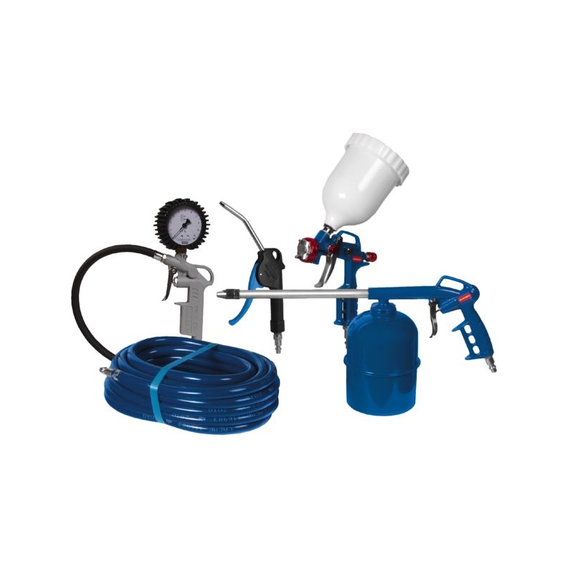 Composé de : - 1 soufflette progressive bec long 110 mm, - 1 pistolet de gonflage 0-10 bar, - 1 pistolet de peinture à gravité (godet 0,6 l, buse 1,5 mm), - 1 pulvérisateur (godet 1 l, tube 250 mm), - 1 tuyau armé Ø 8 x 14 mm x 8 m.